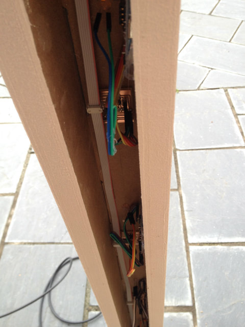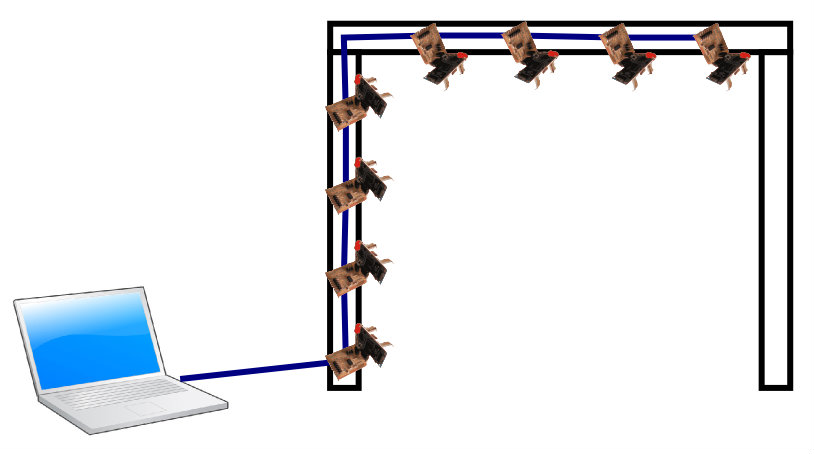 The bus connecting the eight nodes is a 6 cond flat ribbon cable, although really only 4 are used for Vcc, GND, data from nodes to computer and data from computer to nodes. The connection of the cable to the nodes is irrelevant, once all the connectores are plugged in the same way.
