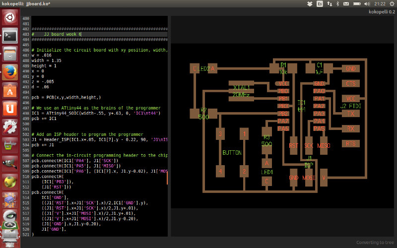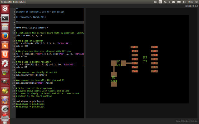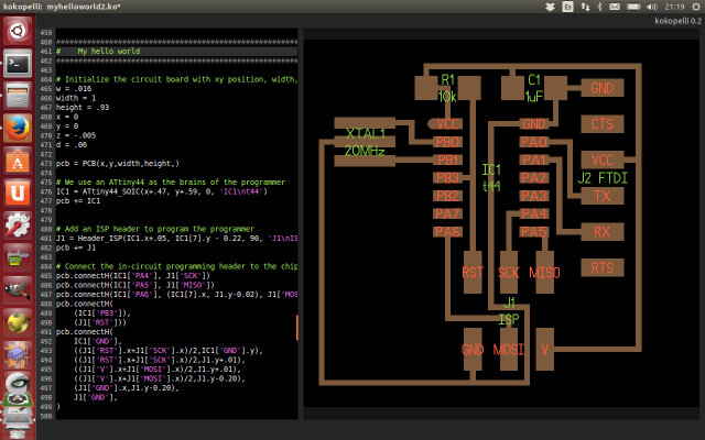 At this moment I thought about going back and use Eagle... but I didn't. In kokopelli's git repository you could find this example of the FabISP design, demonstrating kokopelli's pcb library design. After looking carefully at it and making some tests, I learned how to use it.