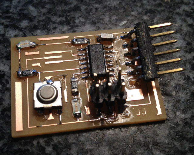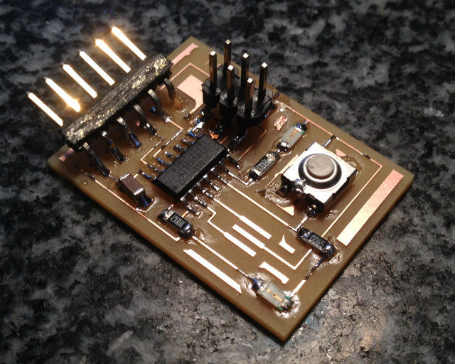 Once your board is milled, it is time also to remember what was done on Electronics production week and solder or the components in the board. You can see in the image below my board finished.