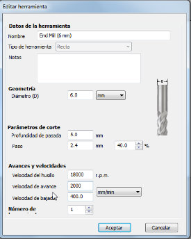 - Define the end mill you will use. In my case, it was a 6mm wood end mill, at 24.000 rpm and 2000 mm/min of speed.