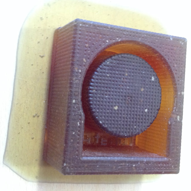 To create the silicone mold, following Nuria advise, I used PMC-121/30 polyurethane rubber compound. The mix ratio advised by the producer is 1:1, so, dimensioning the size of the mold, I mixed 60g of each product and mix it in a glass. Once it was well mixed (be careful not to do it to fast, because you could create bubbles), it was poured on the wax mold.