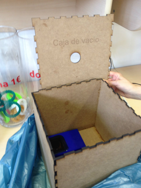 At Leon FabLab there is no vacuum chamber, but the people working there built a nice approach! It is based on a press-fit box, with a hole in the top of the diameter of a home vacuum cleaner. Putting also a rubbish bag around the box, the vacuum obtained is very good!!.