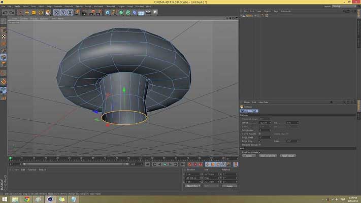 Make another loop selection choosing the most inner ring of your geometry and scale it down by 40 %. Now with the same selection, move it up just a little bit, like 5 cm or so. This way the head of our jellyfish is starting to get its shape. Make another Bevel to the selected ring and give it a low value of 1.1 cm.