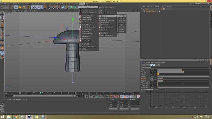 The top navigation menu is where you can acess every option on the program. The toolbars are very special partners in an environment like this one, because you can have a really quick acess to the most used features. The object's tree and properties are two important windows, located on the right side of you screen and where you can see the history and hierarchy of your objects and acess every option available for them. Last but not least, the viewport where the show takes place. Everything you build, modify, animate will be seen on this windows.