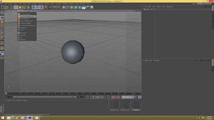 When you open the software a new document is automatically opened so that you can interact with the interface right way. Cinema 4D has six main areas: a top navigation menu, a top and left toolbars, the viewport, the tree and object's properties windows.