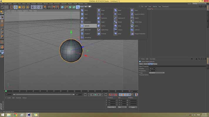 Now on your top toolbar go to the deformer menu (the little blue bended parallelepiped) and choose the Spherify deformer. Click and drag it inside your object, the Sphere. In Cinema 4D, the correct way to make a deformer affect an object is to drag it inside it, no the other way around, always remember that!