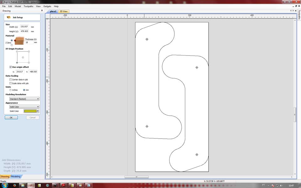 Hopefully you will get a different picture than I (laughs). After opening your DXF in Aspire you'll need to configure some settings. First define the size of the board you are going to cut. Then you can input it's thickness and and set the origin point. Don't forget to reset the X and Y values for the origin offset so the machine recognizes the zero point.