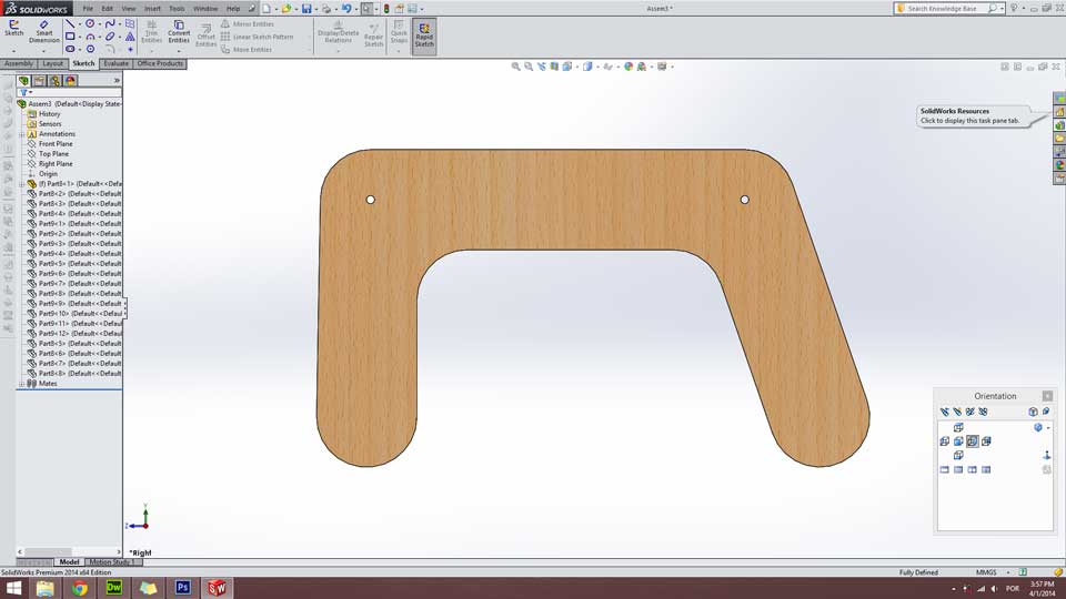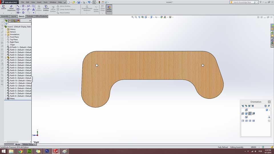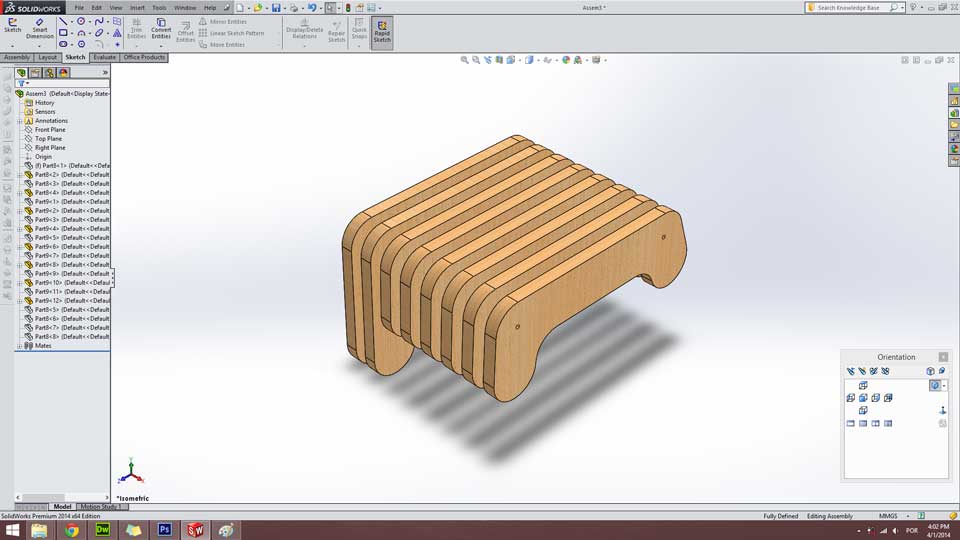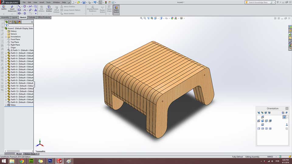 I used Solidworks to make all the parts and assembly. As I said it is based on the same lines of the Layer Chair but bearing in mind it's a stool and the proportions have to change drastically. Wanting to maintain the same language troughout the all project and having the need for a center piece, I sketched this one:
