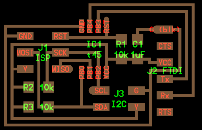 To be Honest this week did not have a lot of circuit design to it because the hello.I2C.45.bridge Board on the Assignment Page has exactly what i need but to me just making the board on the page seemed boring to me so i tride re designning thinking that i can improve upon it but as excpected nothing happedn and i ended up making the same board (It just has all i need no extras PERFECT)
