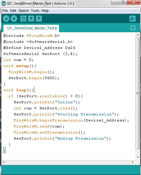 While The Servo Driver Board "Slave" (From The Output Device Assignment) Runs Firmware that allowes it to recive data from the I2C Bus and when get in the byte 0x01 it goes through a basic servo sweep