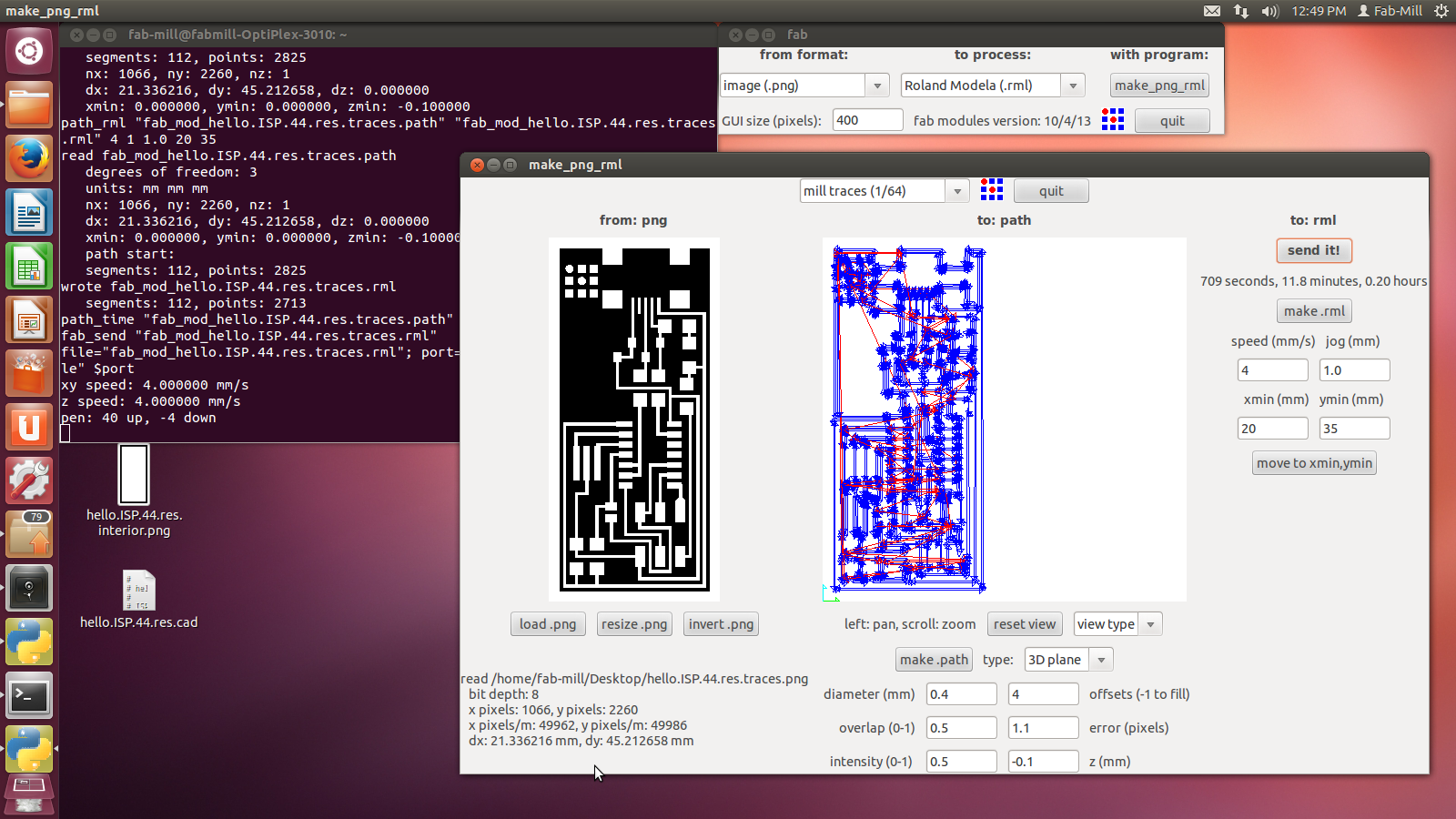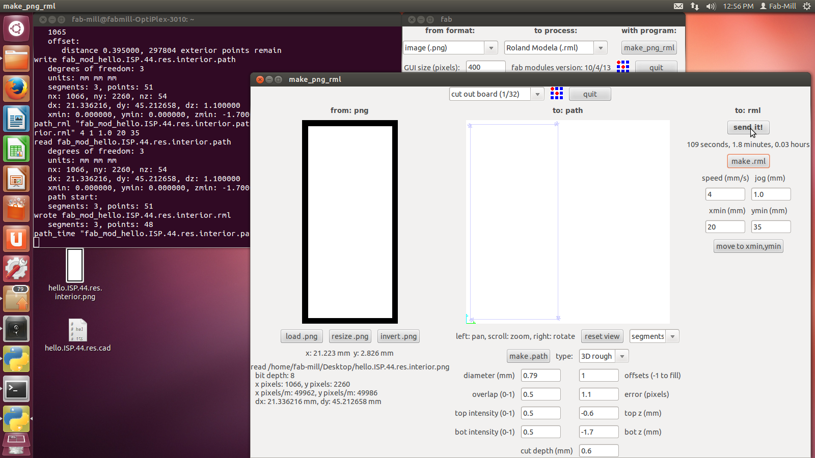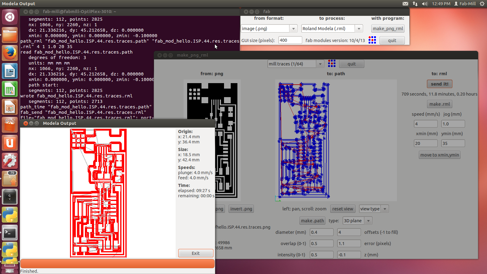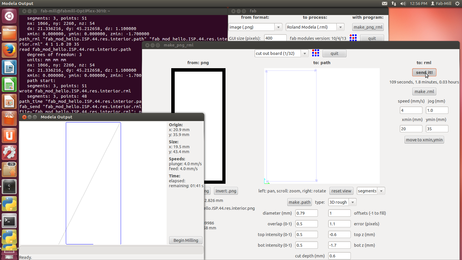 Hit make path >>then>> Make rml >>then>> send it >>then>> Begin Milling