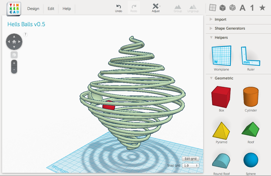 Tinkercad is an online tool and no installation is necessary since it runs entirely from a web browser. All models are saved in the cloud, are private or public, easily downloadable in many formats, has tutorials, and is easy to work with. You can also code custom design tools and/or build off of other custom design tools. I started with a helix tool and then modifed the parameters to stretch. My goal was to create a sphere and as you can see, there is work to be done. Click on image to enlarge.