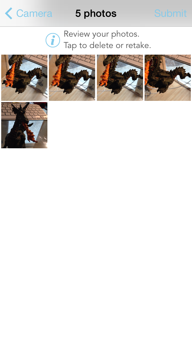 Step 3: Review your photos and delete or retake any that did not work out. It is unclear to me what qualifies as a bad shot other than poor lighting or angle.