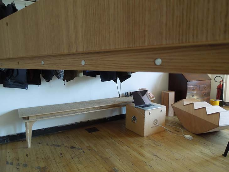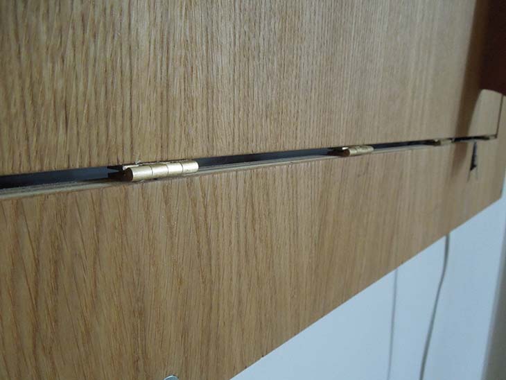 After installing all the parts onto the platform we can start attaching it to the frame. This is the hardest part because the alignment of the platform should be completely straight, otherwise the platform won’t close well. Take your hinges and depending on what type of hinges you use think of a solution to make them aligned perfectly straight.. We had seven small hinges we aligned by putting them in a 90 degree angle to the frame so they would always be in the middle. Mark all the holes, because before attaching them we should drill holes so the screws go in smoothly and we won’t crack the triplex
