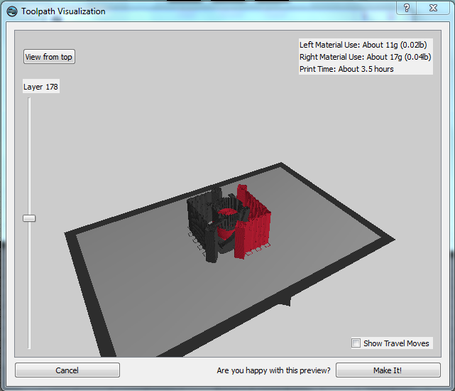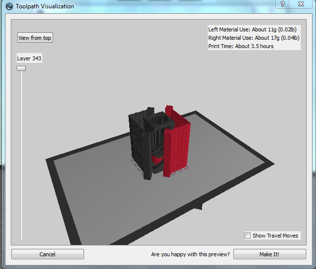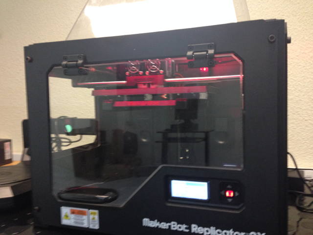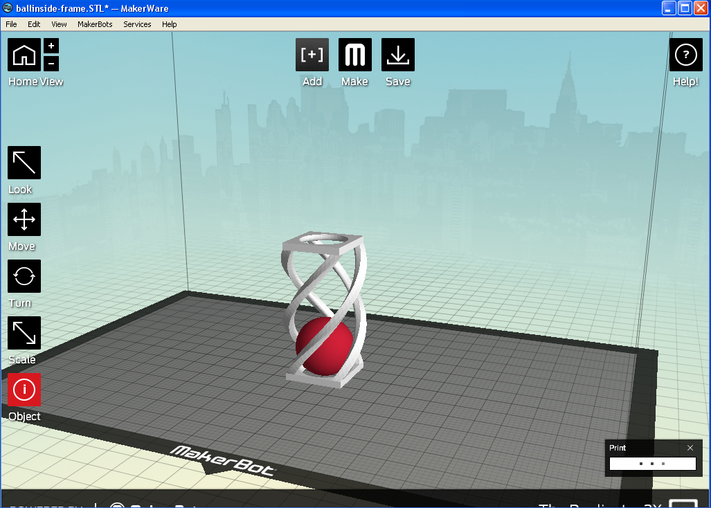 Next, the model was exported as stl format and imported into the makerware software which is the software that comes with the printer. In order to print in two colors, each solid of the object (ball and frame) needed to be exported independently. Later in makerware, each solid was imported and a color/extrusion head was selected for each one.