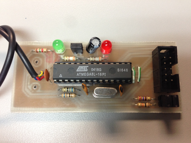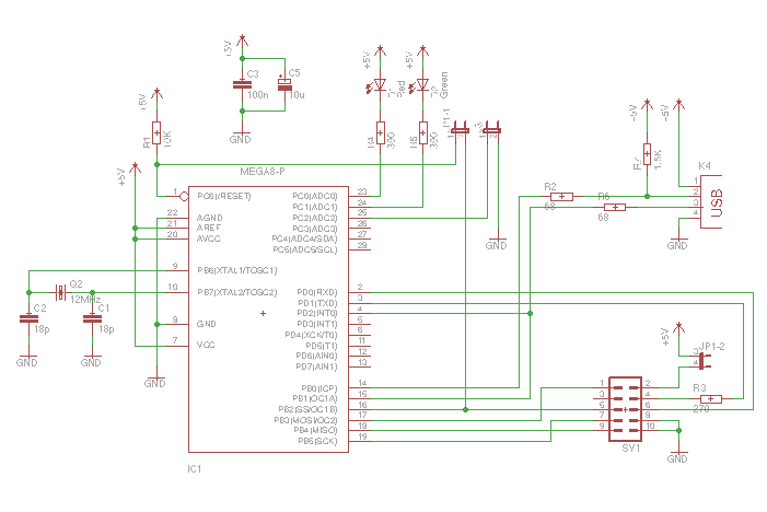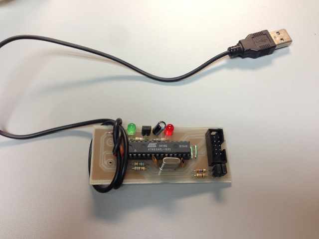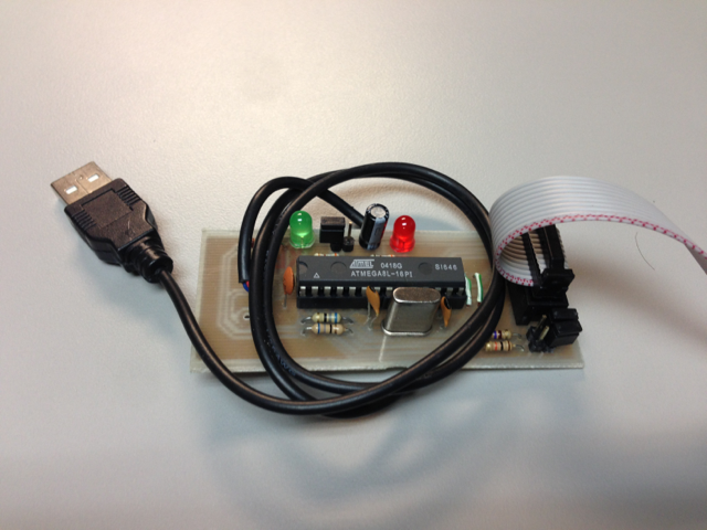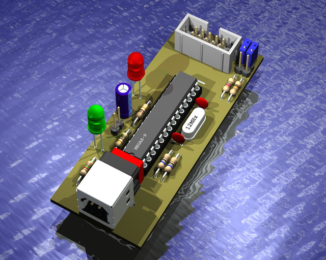 This served as a base to find an alternative to an AVR programmer USBasp by Thomas Fischl that included several alternatives using the DIP package and a single layer board. A render of the programmer can be seen below along with the schematic and board design in Eagle.