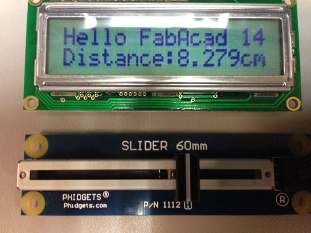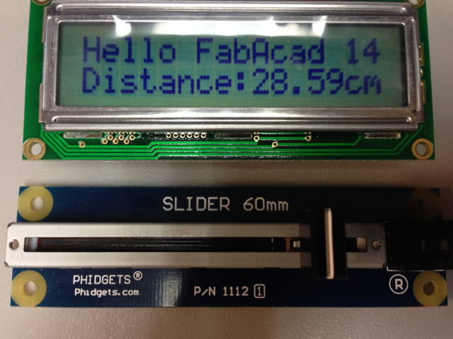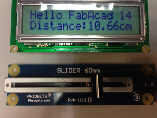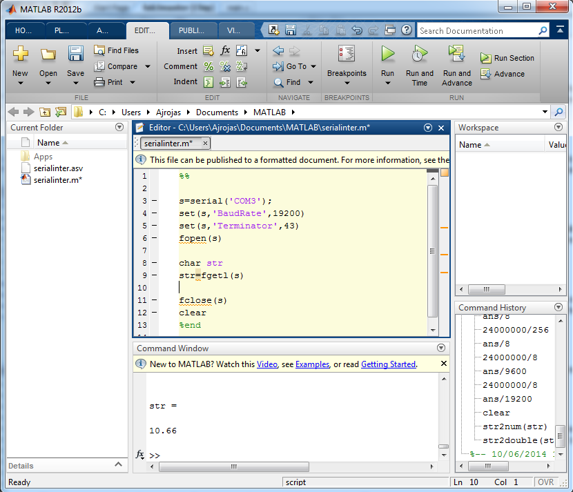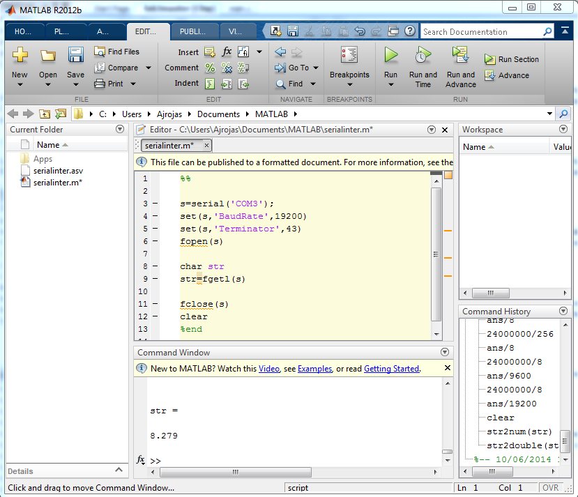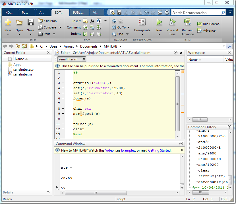 To facilitate the work and to be able to take pictures of what was happening the distance sensor was replaced by the linear slide that provided a more constant signal. The code was developed in Matlab and consisted in creating a serial port object, configuring the speed and terminator character, then reading the data that has been received, and finally clearing the memory of that data. In the picture below you can see the interface with the PC through Matlab.