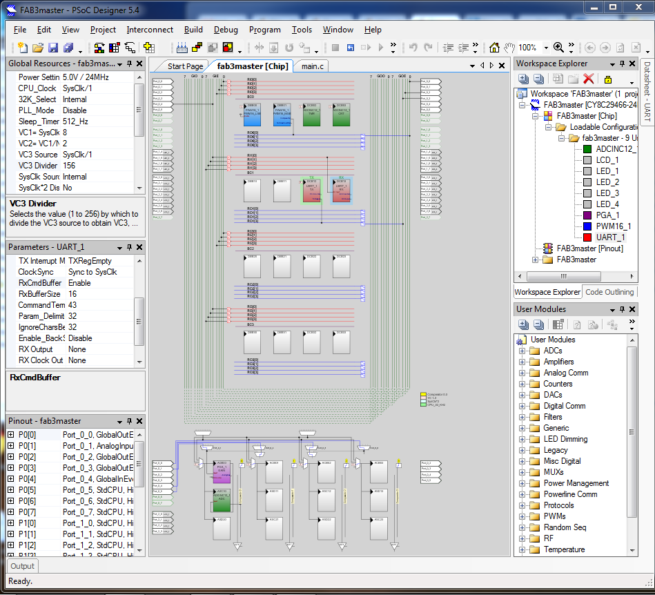 After configuring the speed in the port to 19200 bauds, a similar adjustment was done in the PSoC, giving the UART module a clock signal of the system clock (24 Mhz) divided by 156 and it internally divides it again by 8, giving a Baud Rate of 19230.7 which is the closest value. This was the only adjustment necessary to the program made for the master micro controller in the networking assignment. See VC3 Divider on the left column of the image below.