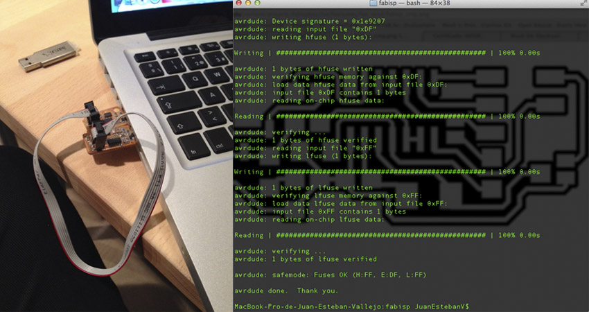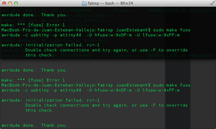 Once I soldered the circuit I proceed to program it, first I download and installed CrossPack-AVR-20130212.dmg from here here. Then I downloaded and unzipped the firmware.zip file Then following the instructions suddenly appeared and error, the Terminal said that there is problems with the connection so I checked again the ports and decided to put a mobile card to make thicker the board.