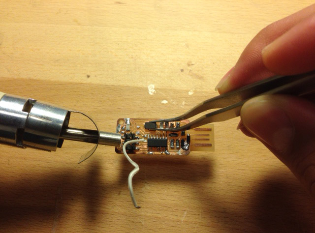 Also we have a new heat gun so I practiced unsoldering the components of the old FabISP and save some components. Attiny44 is broken so I threw it away.