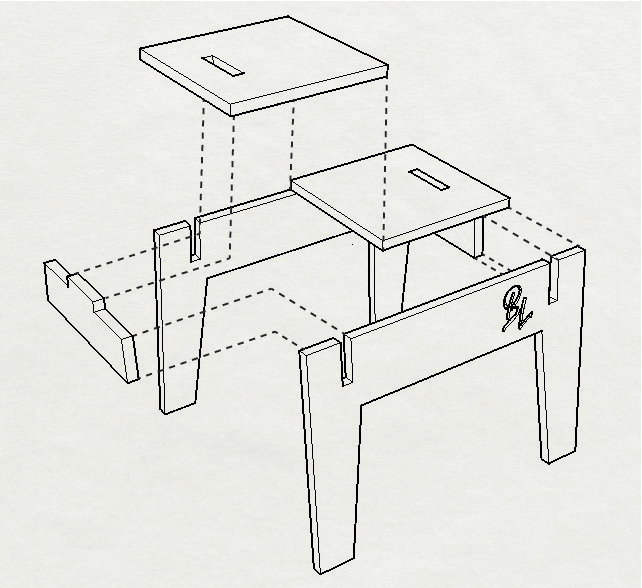 The designs were also thought to be very efficient in wastes, on the stool we have 4% of waste of a full sheet of wood (1200mm x 2440mm) that can be even less because on the left part without pieces can be included seat tops or other pieces to be cut.