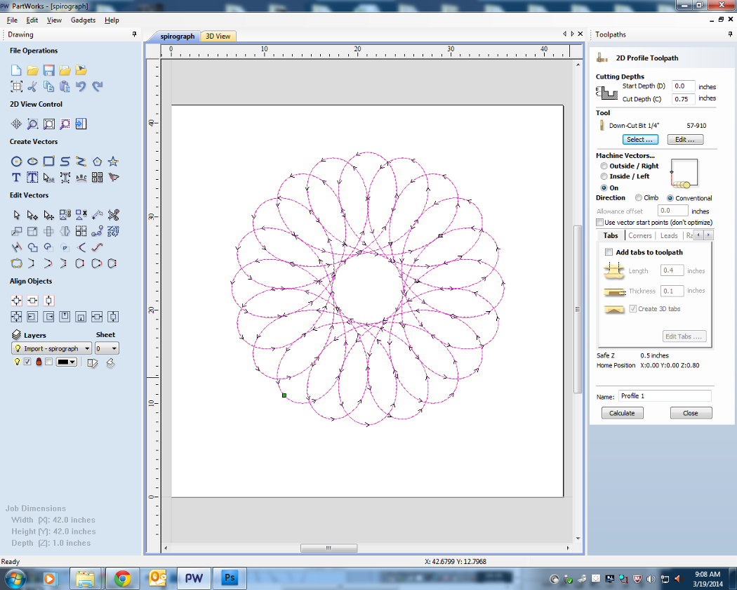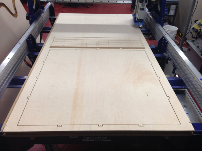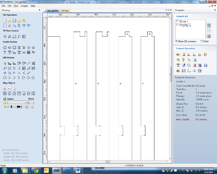 I used Part Works to set up my file to run on the ShopBot CNC Router. Most of the input values are inconsequential since I ran the machine with the spindle off, but I did set my tool diameter to .25 inch, feed rate to 102 ipm, and plunge rate to 30 ipm.