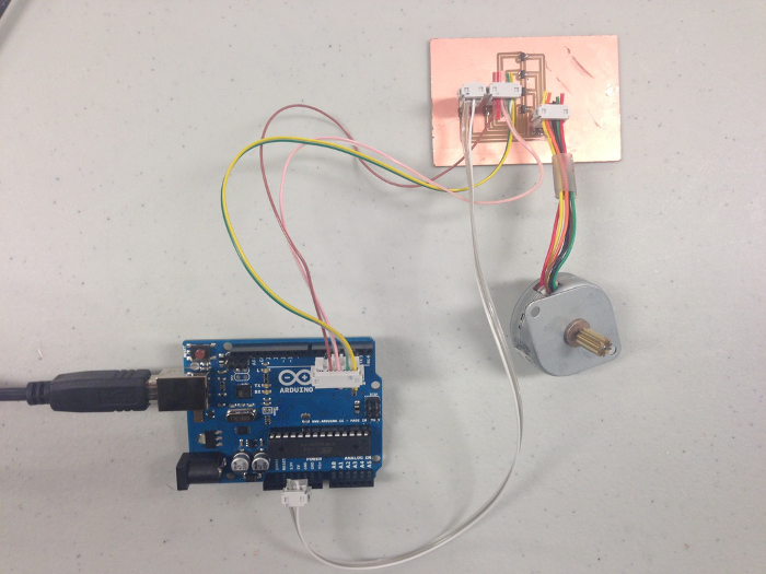 I connected pins 2,3,4,5 of the Eduino to the jumpers on the driver board. I then connected the GND and V on the driver board to a 12V power supply, and connected the GND on the board to the GND on the Arduino. Lastly, I connected the driver board to the motor.