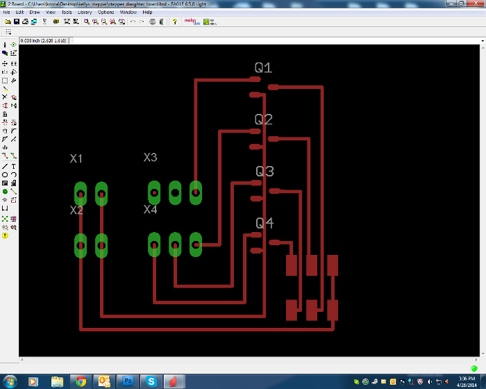I decided that I could make a very simple design with only transistors and pads to connect to the motor, main board, and a power supply. After adding these components, I exported a png file for fabrication.
