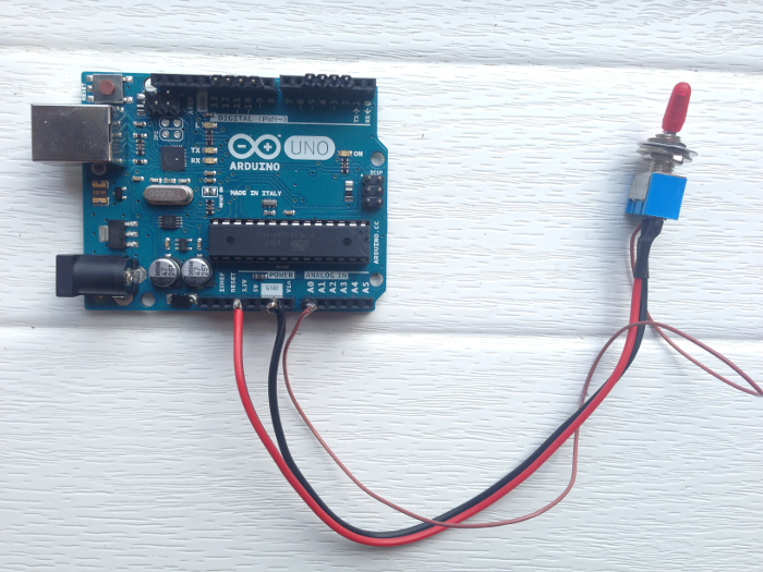 Connect a switch to the Arduino board via Analog Input 0, V, and GND