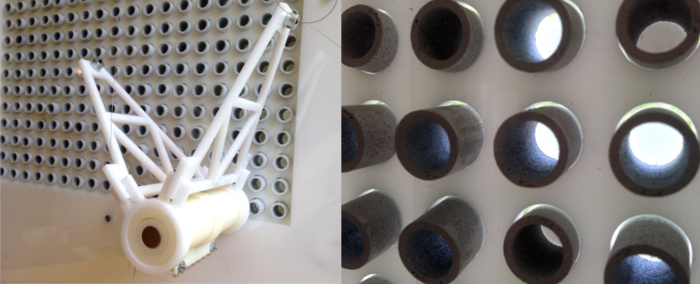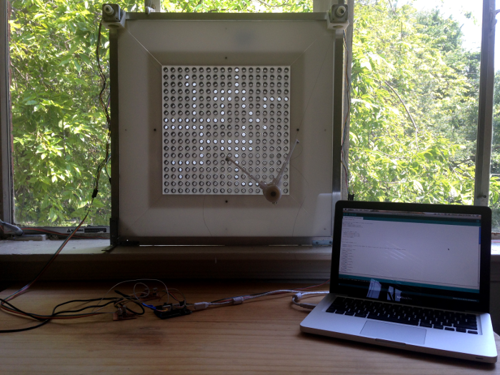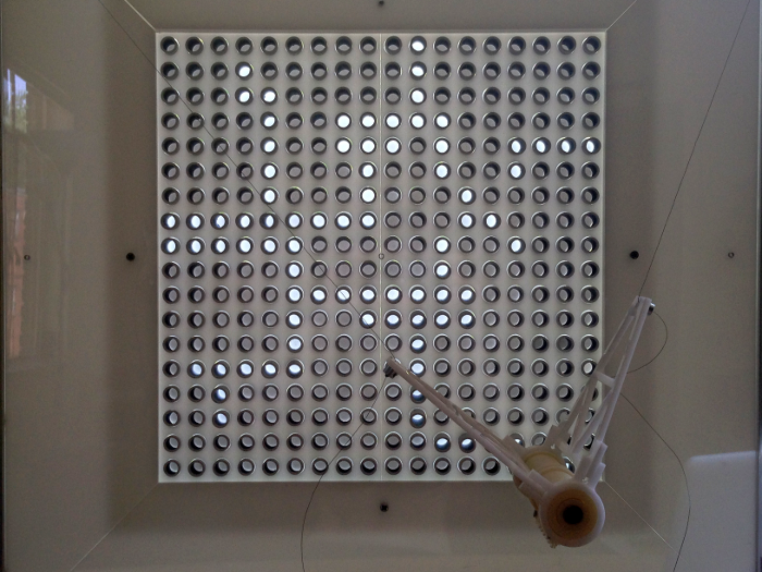 The system operates by digital user input; code is translated into patterns. A multi-layer screen is controlled by a magnetic actuator hooked up to two stepper motors. The screen consists of a perforated inner layer filled with freely-sliding hollow metal pegs. This inner layer is bound by two exterior layers of clear glazing. The back layer has opaque pattern of dots corresponding to the pegs. As the actuator moves across the screen’s surface, the pegs are pulled forward to their open position, generating patterns of natural light. A similar mechanism on the backside “resets” the pegs to the closed position.