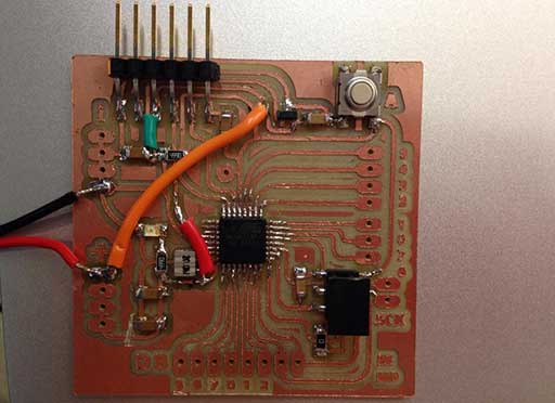 We used a LED and a breadboard. We also checked the ATMega328 pinout board to make our Arduino program. We succeeded in making the LED blink! You can check the video on Jasmin's blog.