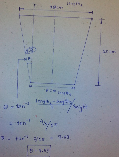 I am thinking to design a hopper for flour mill and it should be pressfit for that purpose angle of adjacent wall of the hopper is calculated.So all walls will fit precisely in adjacent wall, Following figure 1. shows the rough scketch & its angle calculation (Upper Length=10cm, Lower length=6cm and Height=15cm)