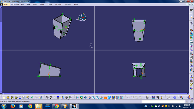 At this stage i need to make assembly of the above individual part.If my assembly is correct then it will cut the part perfectly.Click on Start then click Mechanical Design.submenu Assembly Design will appear and here i have to import above .CATpart extention file and arrange parts with properly using allignments. Select the faces that i want to pressfit using coinside and contact contraints. I used a)contact b)coincidence c)offset and d)fix constaints to make assembly.