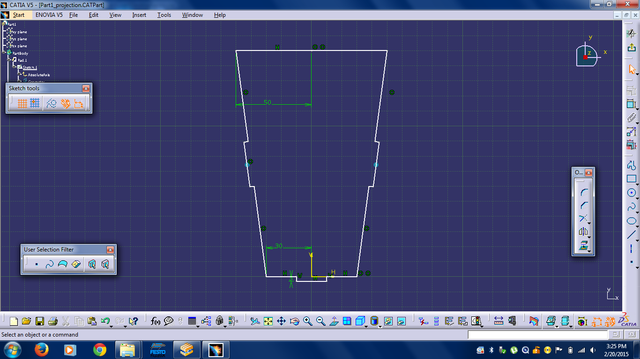 In CATIA follow the steps as, go to the Start Menu then click Mechanical Design.A submenu Part Design will appear then click Open Scketcher in Scketcher mode.Select proper axis and Draw the Scketch with proper dimension.To apply Dimension i used Dimension constraints.While creating scketch i used Command a)Line, b)Mirror, c)Translate, d)Reference line and e)Center Line. refere figure.2