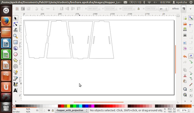 In the Computer contol cutting of object 1: Hopper , To cut the part created in CAD Design it was exported in .pdf form for the Epilog Laser then imported to inkscape. set line width to 0.01mm and again save the file in .pdf extension. Figure 1 shows the ready and well arrange file in the inkscape