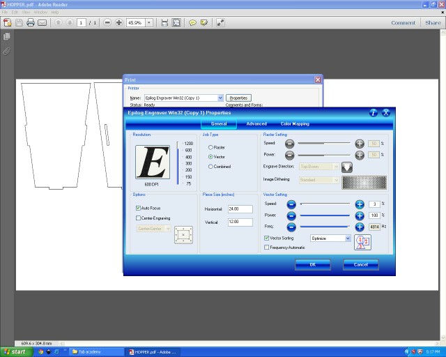 I used Epilog laser to cut the parts. selected Vector cutting method in which setting used were speed=1%,Power=100%, and frequecy=5000%