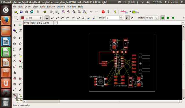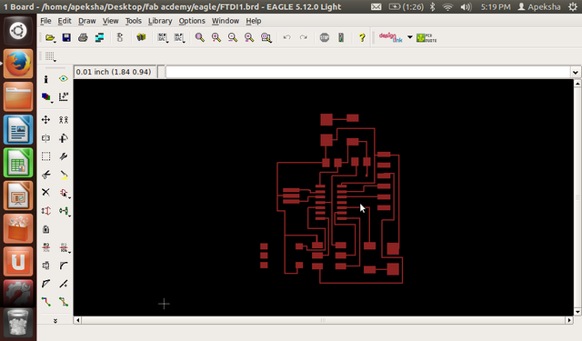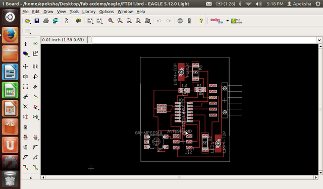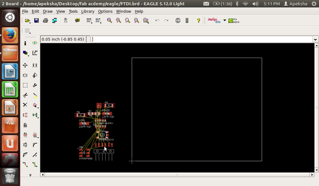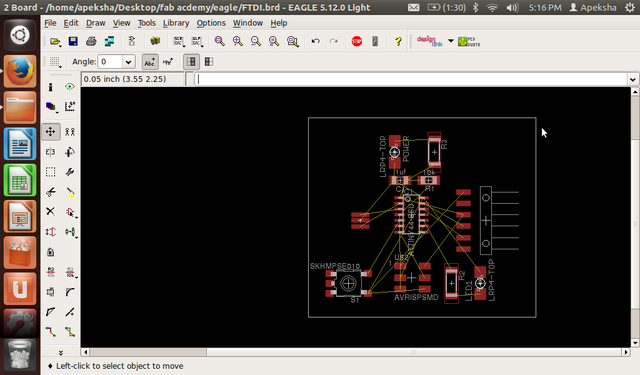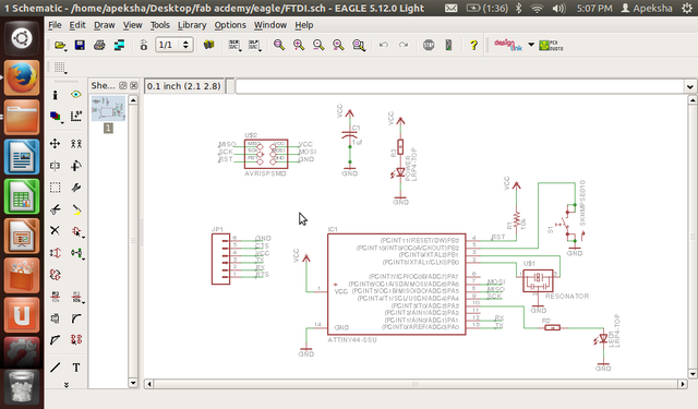 Step 1: Designing PCB using eagle, first Download Eagle or install from the terminal for ubuntu using sudo apt-get install eagle then open eagle go to menu file--> click on Schematic Following figure.1 Shows the schematic I downloaded FTDI circuit from Fab academy website, and added One LED and BUTTON here Button is connected to PORT PB2(pin7) of Attiny44 and other pin is connected to GND.LED is connected to PORT PA3(pin10) through resistor.