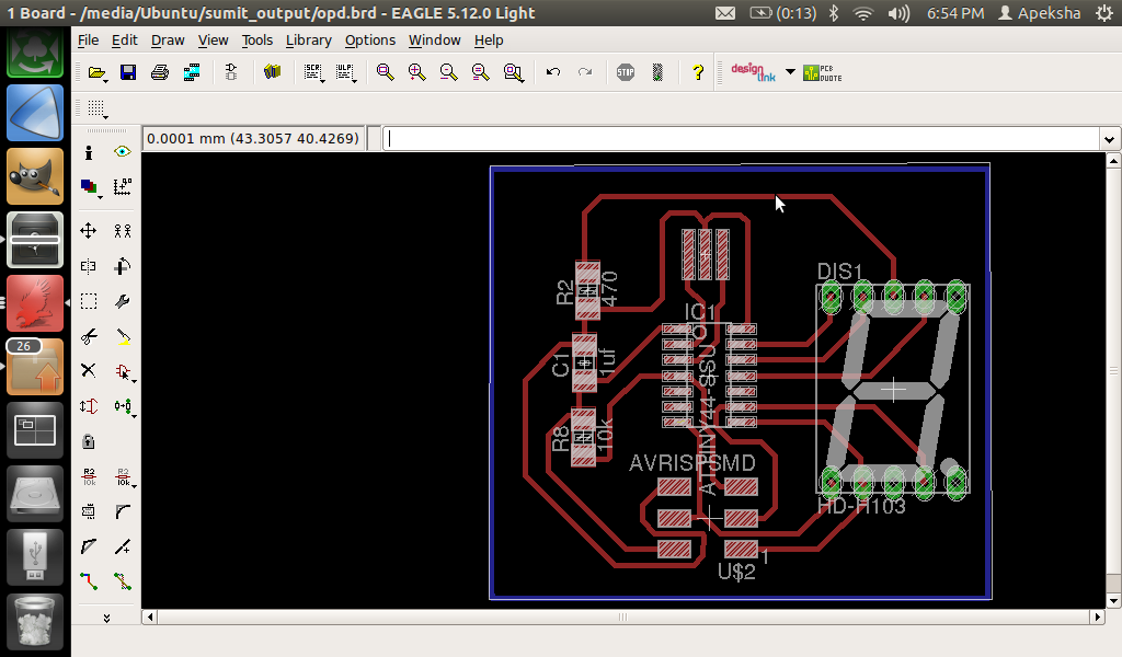 In the circuit diagram we have used 1) seven segment display 2)6 AVRISP pin connector following figure.2 shows the board file of the seven segment and i have used one jumper