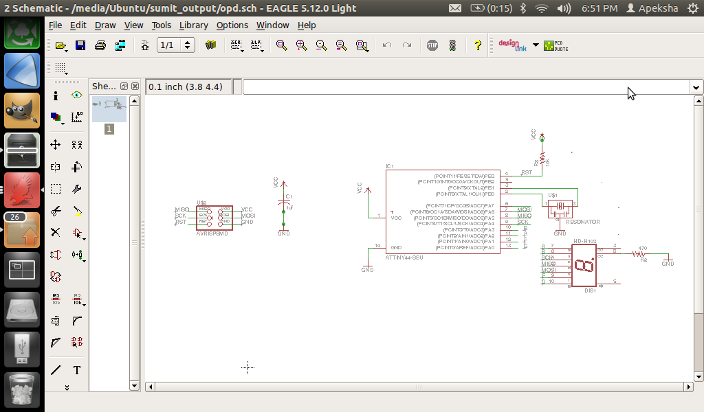 First we need to design the circuit in eagle.Following schematic shows the seven segment display, we have imported the seven segment display and The Attiny44 IC