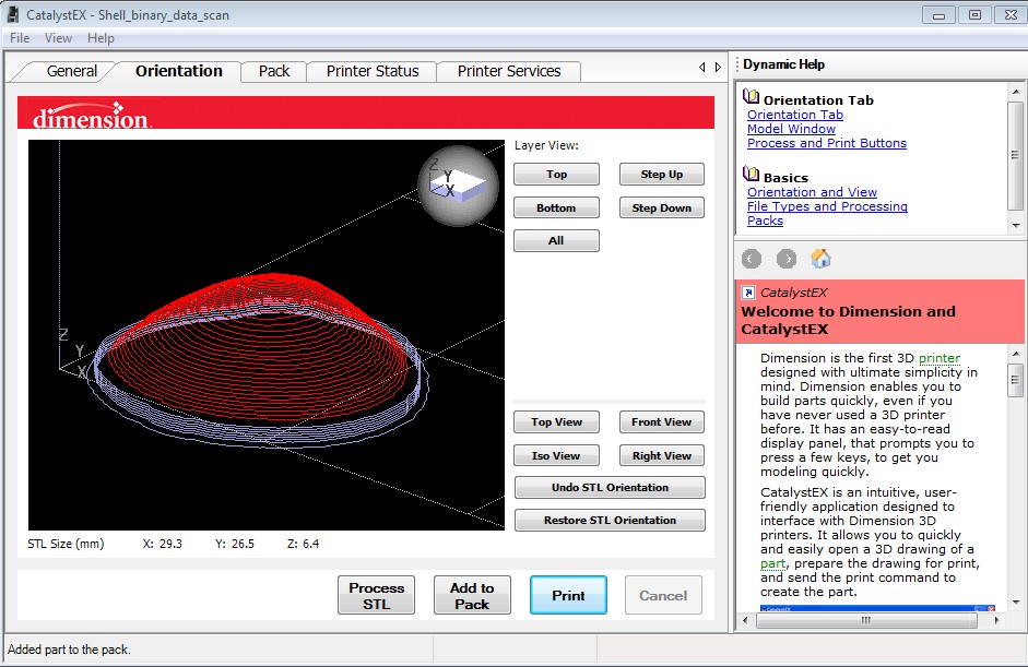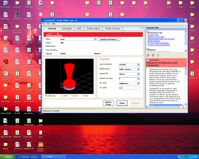 Following figure shows the orientation of the .stl file in the catalystEX printing software with the support material and the actual ABS material form.Blue color shows the support material and red color is the actual material.
