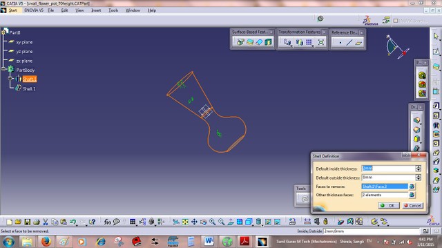 Above 3D model of flowerpot is solid model.For 3D printing i require hollow 3D object.following figure 4 shows the shell command setting to make it hollow, I will prefer Object thickness 2mm.