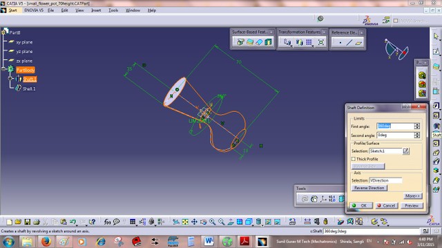 To make 3D model one has to get out of sketcher mode. following figure shows the part design mode.In the following mode,One can revolve the scketch OR 2D profile around the relative axis.