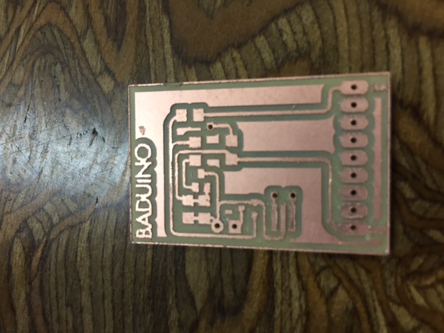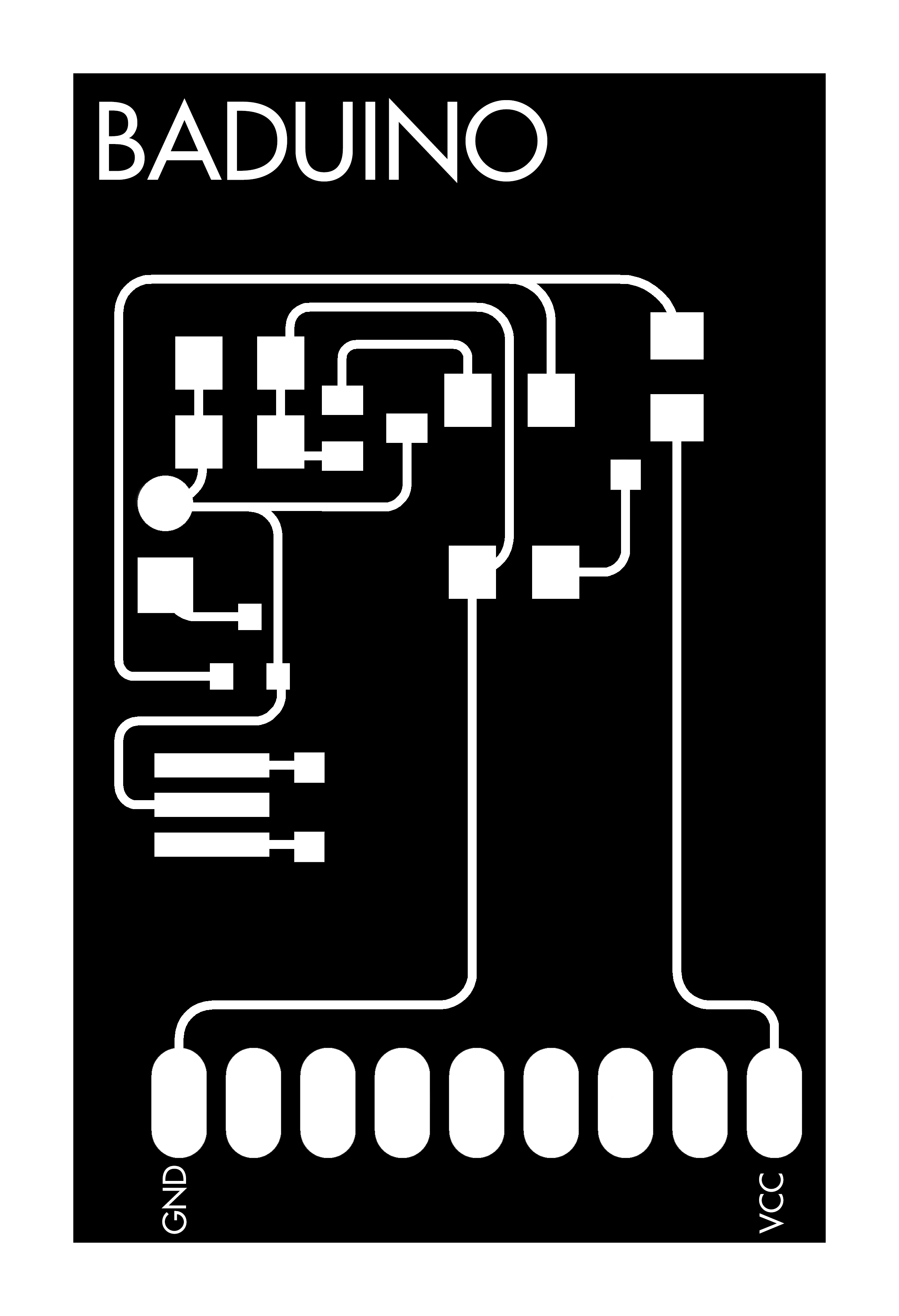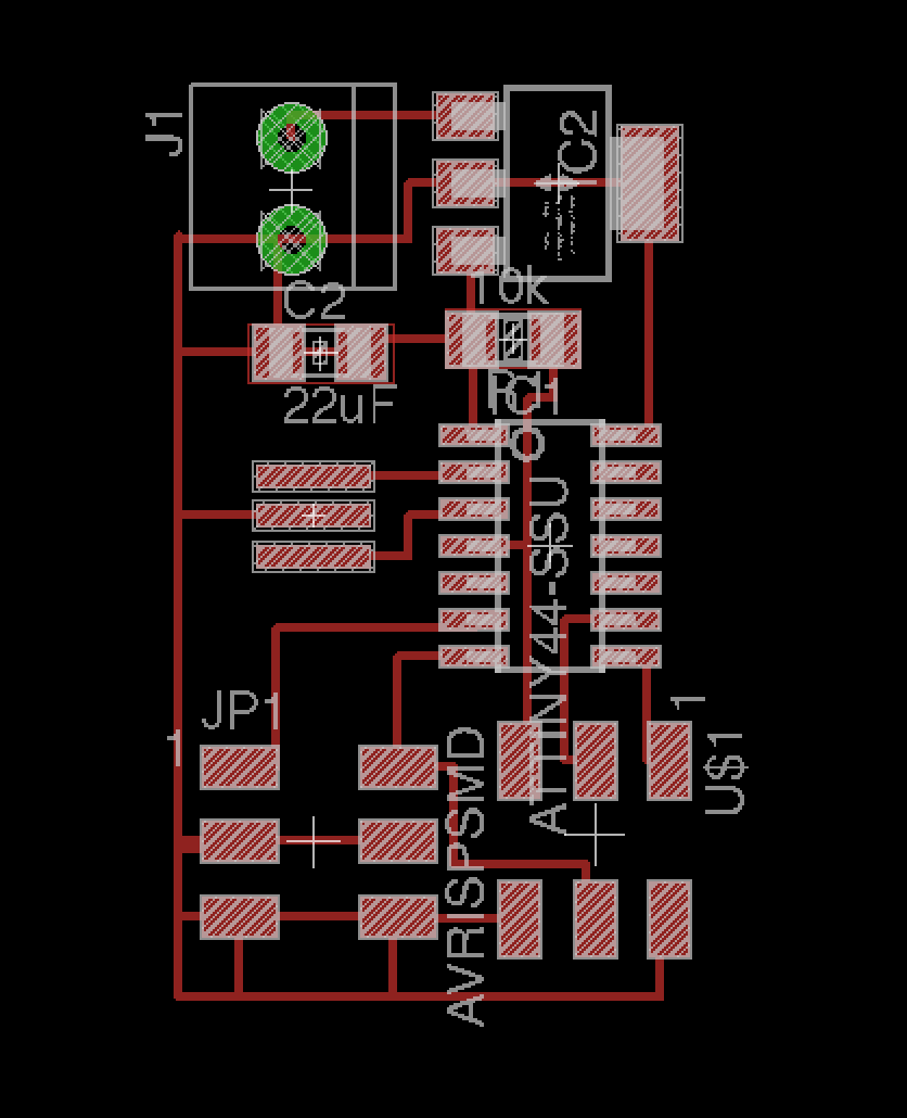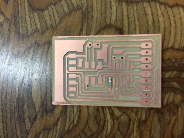 Ben and I created this in Eagle with not too much trouble apart from exporting the PNG correctly so that we were milling in the right places. Craig who had milled double sided boards before gave us a good tip on how to line the board up when you go to flip. Me and Ben originally thought that we could laser cut a piece of cardboard to put onto the copper board where we could use it as a template to line up both side perfectly and have a little marker point on the cardboard to line the mill piece up to. Craig also mentioned that the bottom side a needs to be reflected otherwise the through holes wonÕt go through the same spots.