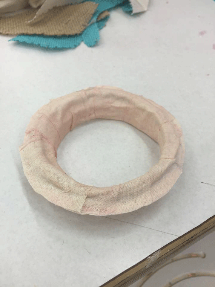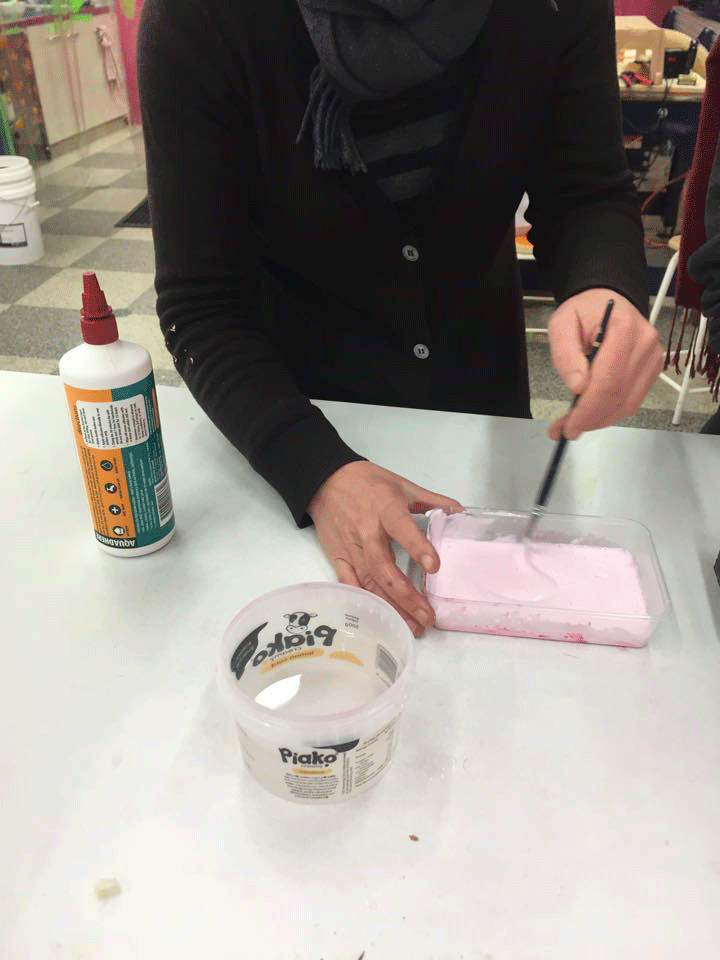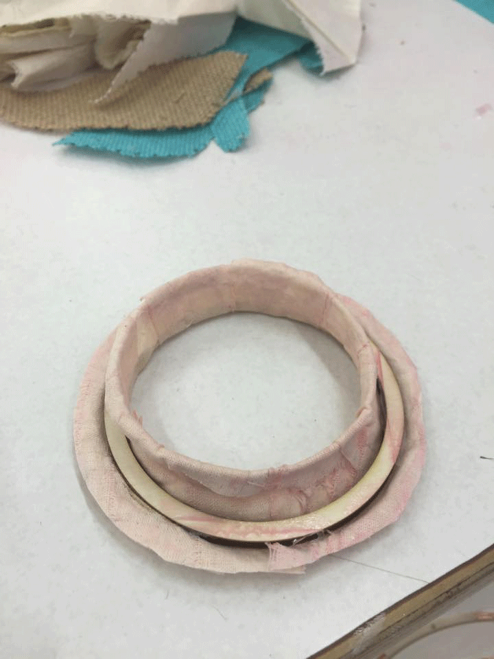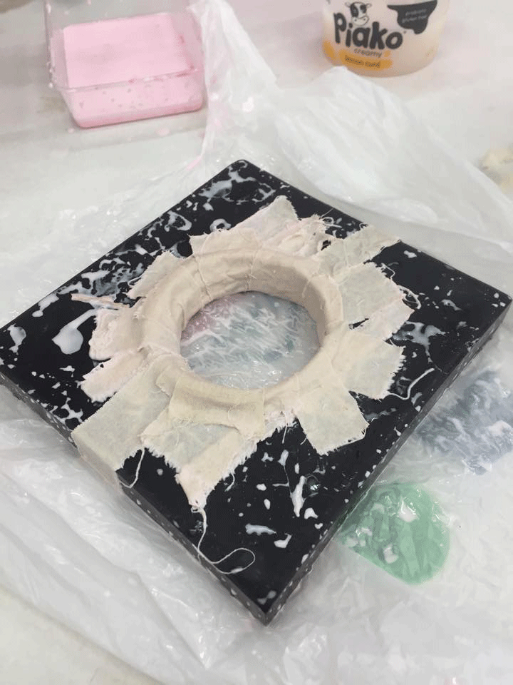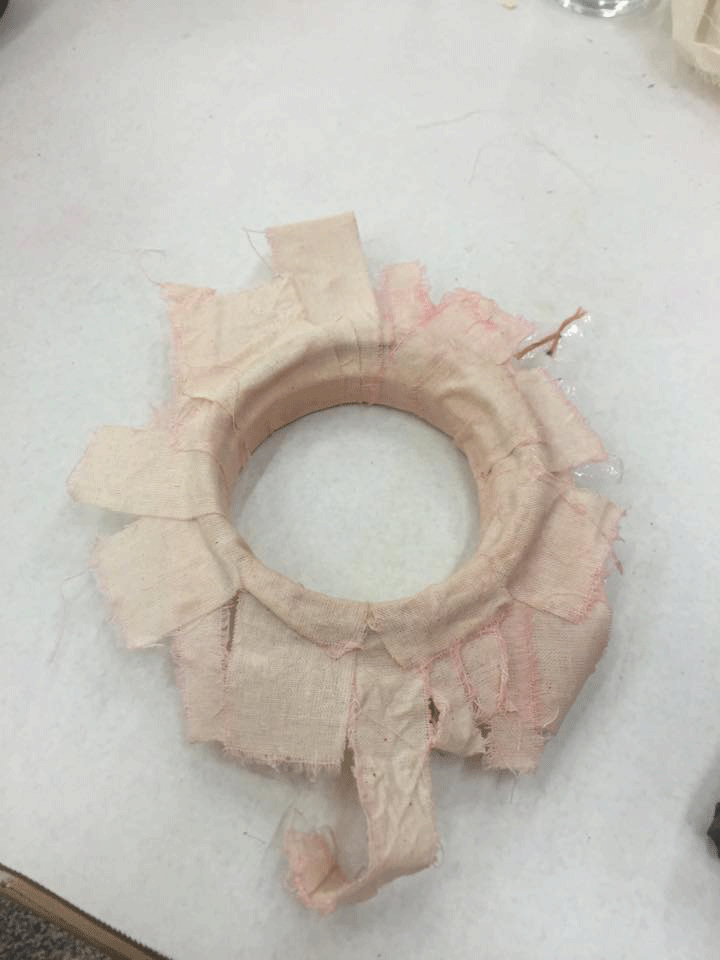 I also changed my mind on using paper and decided to use a thin type material that I would use and as easy to use as paper. We mixed up a little bowl of PVC and warm water and began the process of applying the material to the surface. It worked reasonable well and the fibres bonding together well.