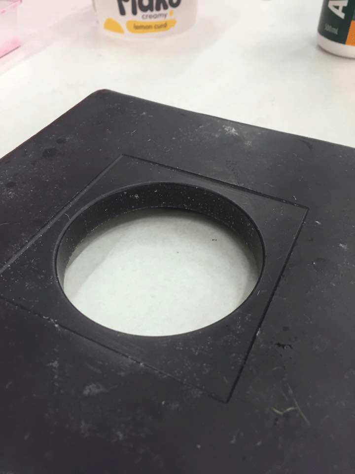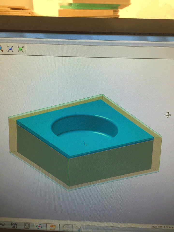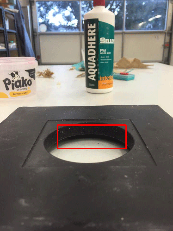 I milled out my wax block and realised that I had turned my wax block the wrong way up on the machine and that it had milled all the way through because the centre on my wax block and the bed size was not flush with the bed. This gave me a big hole in the middle of my wax block. This was the second time that I had milled this object out after Wendy had accidentally broken my other model. I didn't want to spend any more time on it than I already had and Wendy had said to me that I had already demonstrated what was required for this week in terms of the machining and that I could just use this model even thou it wasn't perfect and still use it to mould around.
