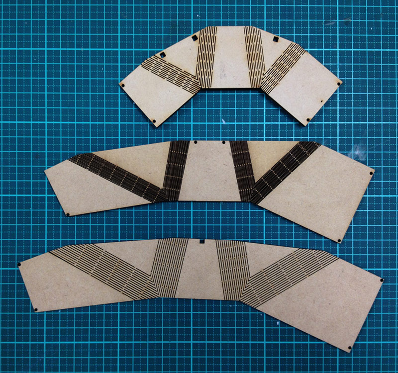 I did some experiments on laser curve bent wood with MDF. Hinge gaps are too big in the first generation , so that it sometimes slplited when I bent. The 2nd generation is the worst. The 3rd one is not bad.