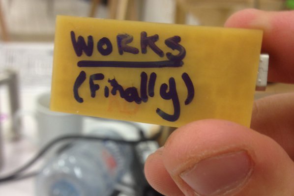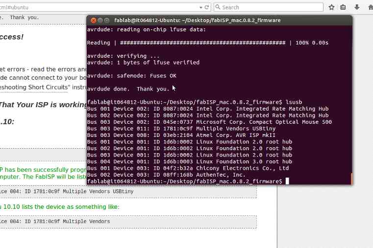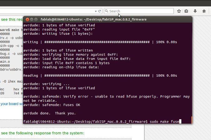 The first problem was that I was not running make fuse with administrator (the sudo command) which threw a cog in the works. Then my board was accepting the code, but was not showing up on the computer after finishing (using lsusb). Eventually my ISP gave up and died (I could with the multimeter reading showing 0.1 volts). It was back to the milling machine and soldering bay for a third time.