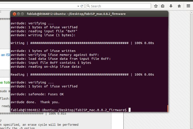 After completely redoing all of the milling and soldering a second time, I started to move onto the programming of the board. I wanted to use Windows, which I have used for most of my other projects. Unfortunately I got an program error when running make fuse After looking at the board, reinstalling avrdude and cygwin and running as administrator the error still was not resolved. I gave up and tried to use make on the fablab linux laptops. I managed to install Avrdude and GCC fine, but had troubles installing the code on my ISP.