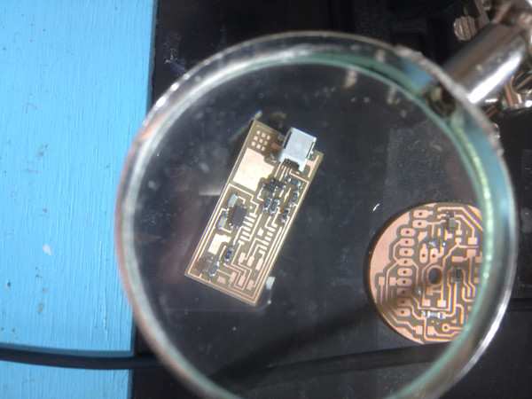 The second lesson I learnt was the order of soldering the components. I followed the advice from the video lecture and soldered from the middle outwards. My advice is that you should solder the smallest joints first, or in the case of the fabISP, the micro usb port. I spent a good 3 hours carefully soldering all the components before completely ruining the board by scraping off the copper by accident when soldering the micro usb.