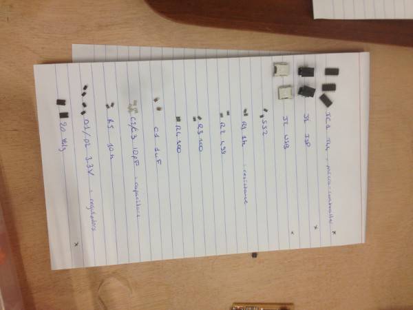Stuffing the board was not as easy as milling. It felt a bit like arranging grains of sand into a picture. The first thing I learnt was not to fix the board to the table. Being able to rotate the surface you are soldering onto makes the process much easier. Having had a small amount of soldering experience, I felt pretty confident with the process of soldering. Heat up the copper pad, apply a small amount of solder to the tip to create a small puddle on the copper, pick up the component, heat up the solder puddle and attach. Then it is a process of just heating up the other end of the component and copper underneath it, then applying a small amount of solder.
